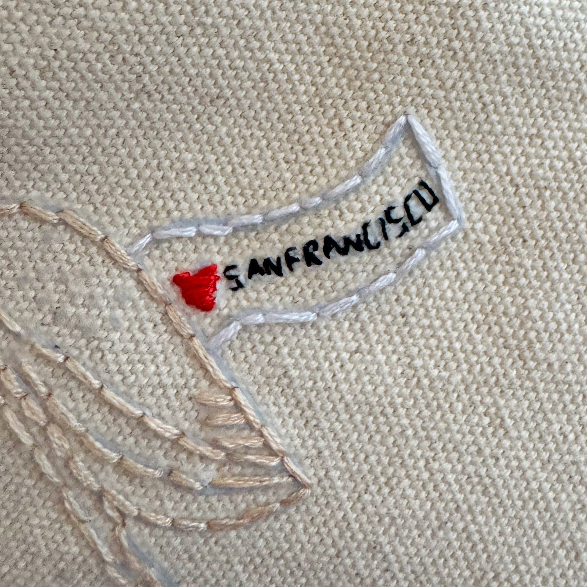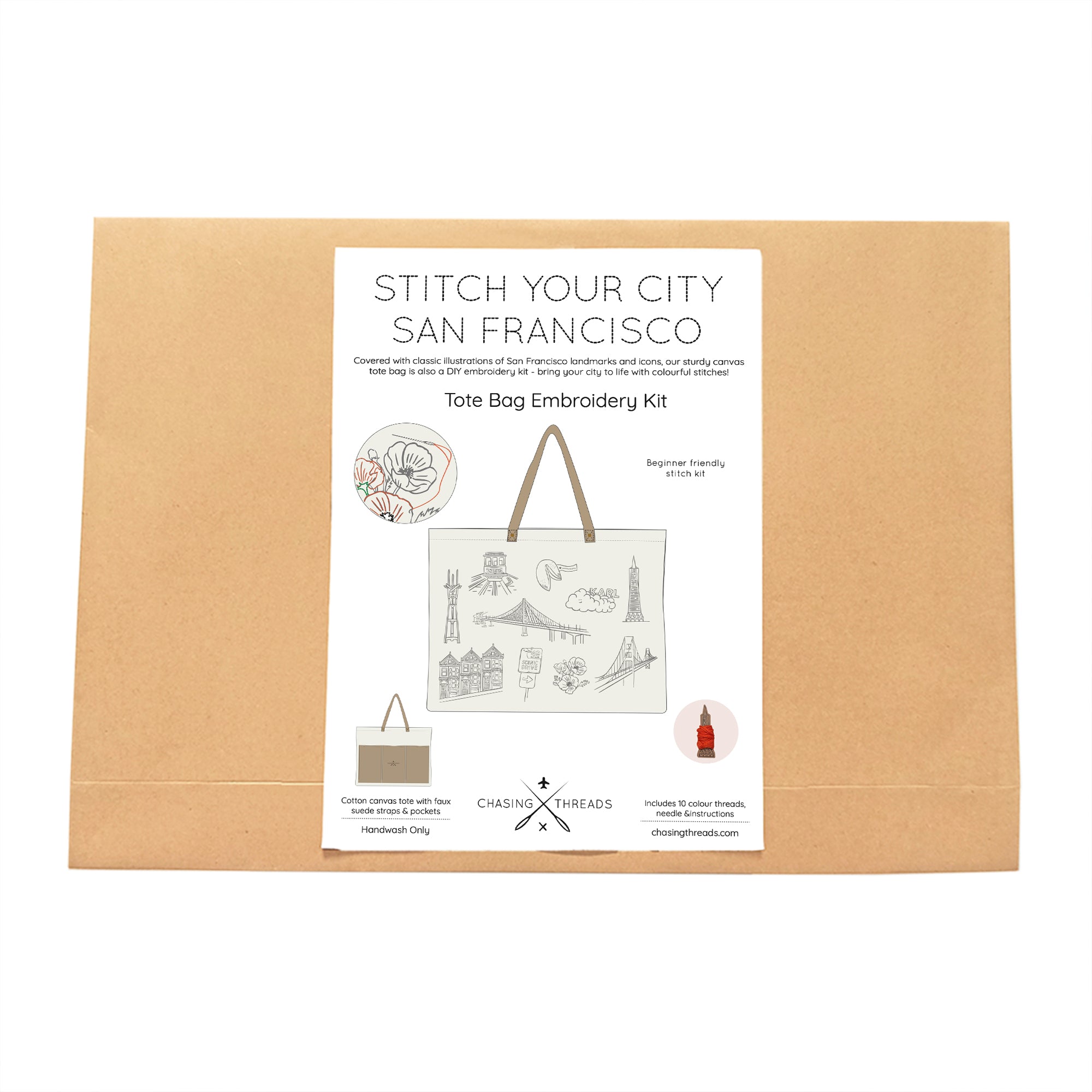 This unique tote bag features 10 iconic San Francisco landmarks printed in crisp outline, ready for you to embroider in vibrant color. Use it as a creative “bucket list” of must-see spots around the city, or simply enjoy crafting a wearable piece of art that celebrates your favorite place.