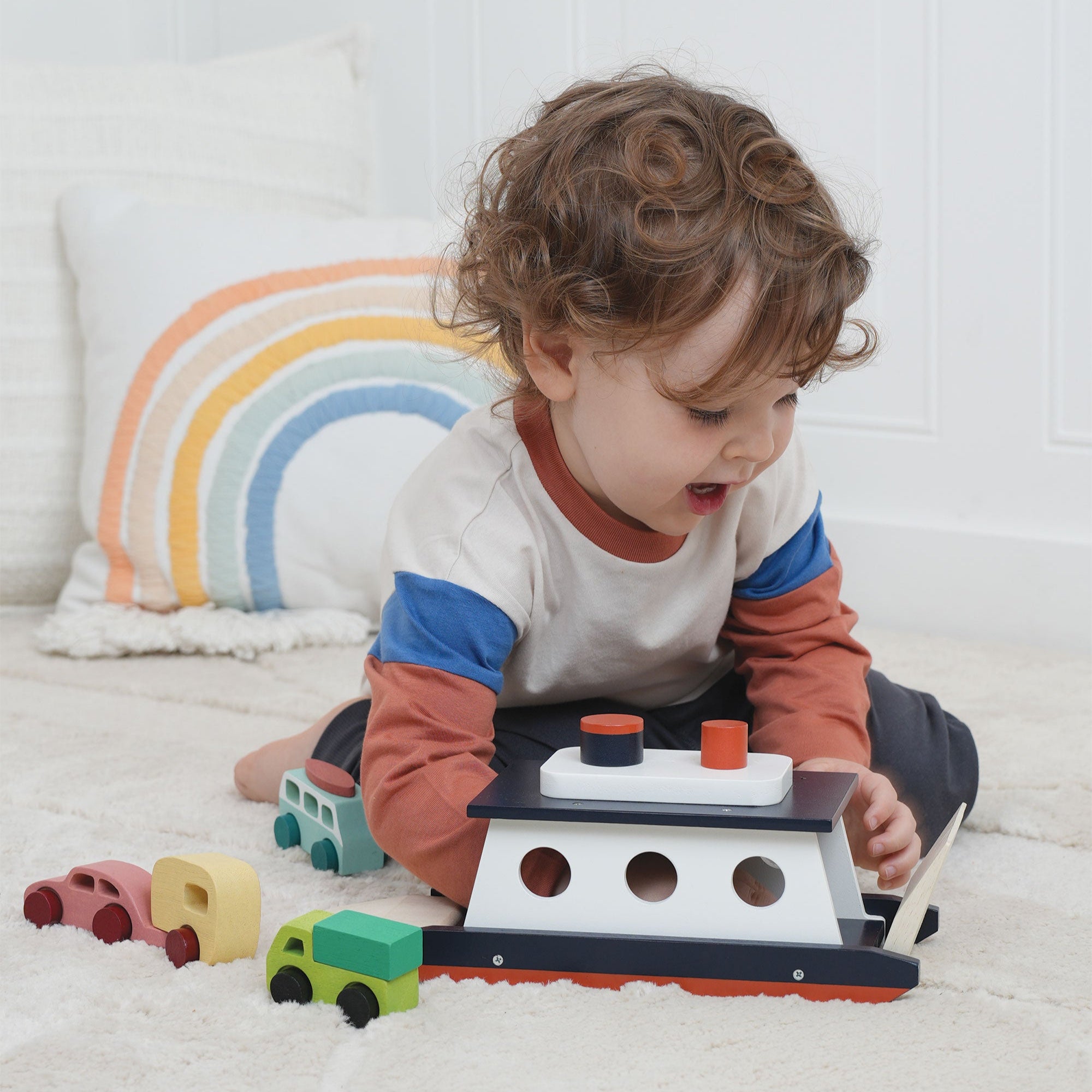 A minimalist car ferry with round windows with loading and unloading ramps. Transport the included brightly colored car and camper, a camper van, and a truck across the waters. Promotes imaginative play and builds fine motor skills.