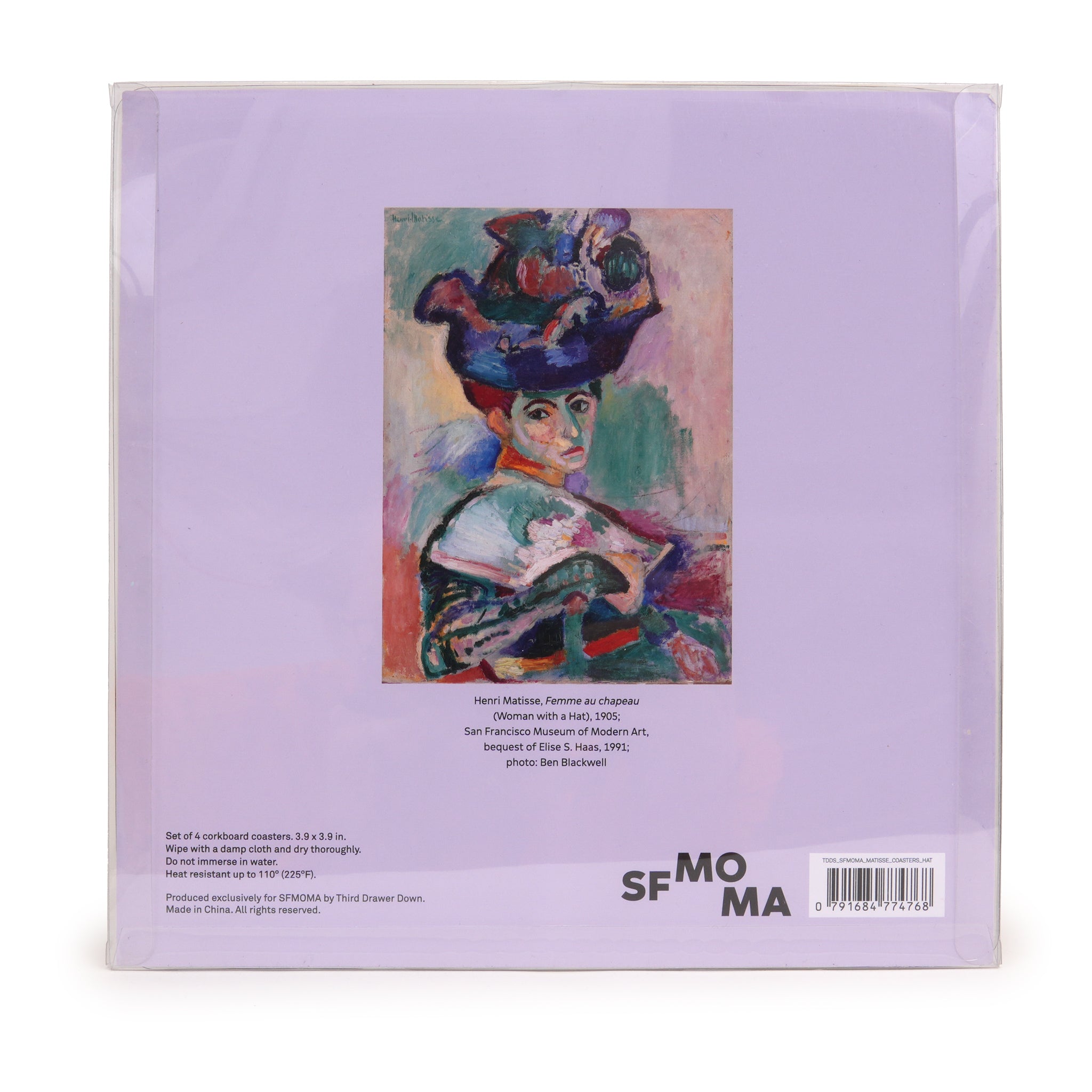 Set of 4 corkboard coasters featuring Henri Matisse's iconic "Femme au chapeau" painting.