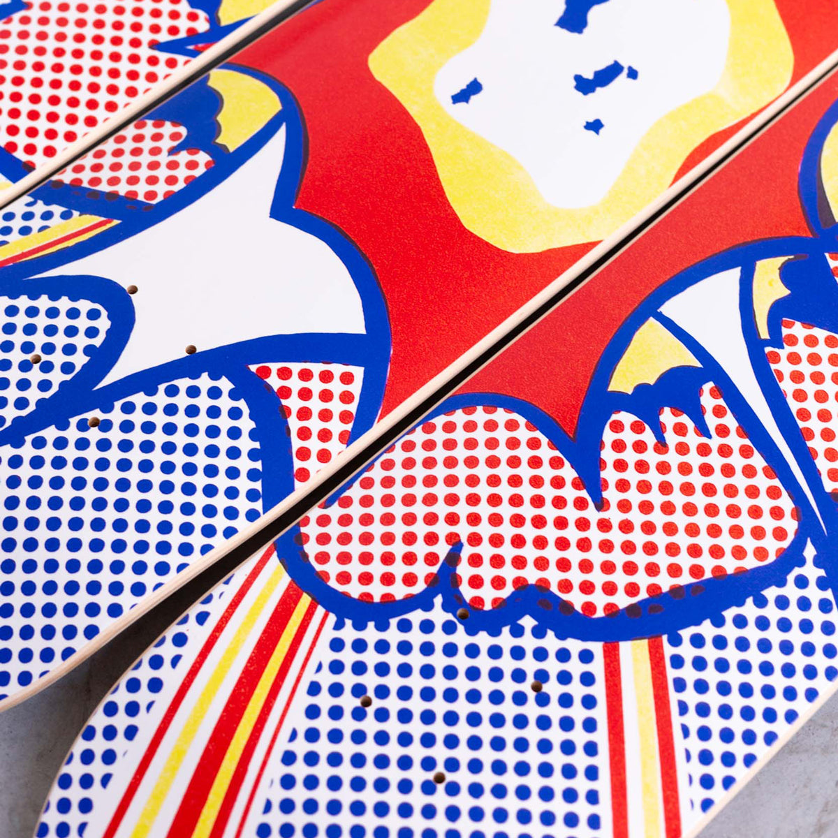 Presented across this triptych is a flat cartoon explosion, illustrated through the layering of Ben-Day dots and primary color hues. Although impactful in its power, the blast neither appears threatening or scary. Instead, it catches the viewer’s eye and sparks active curiosity.