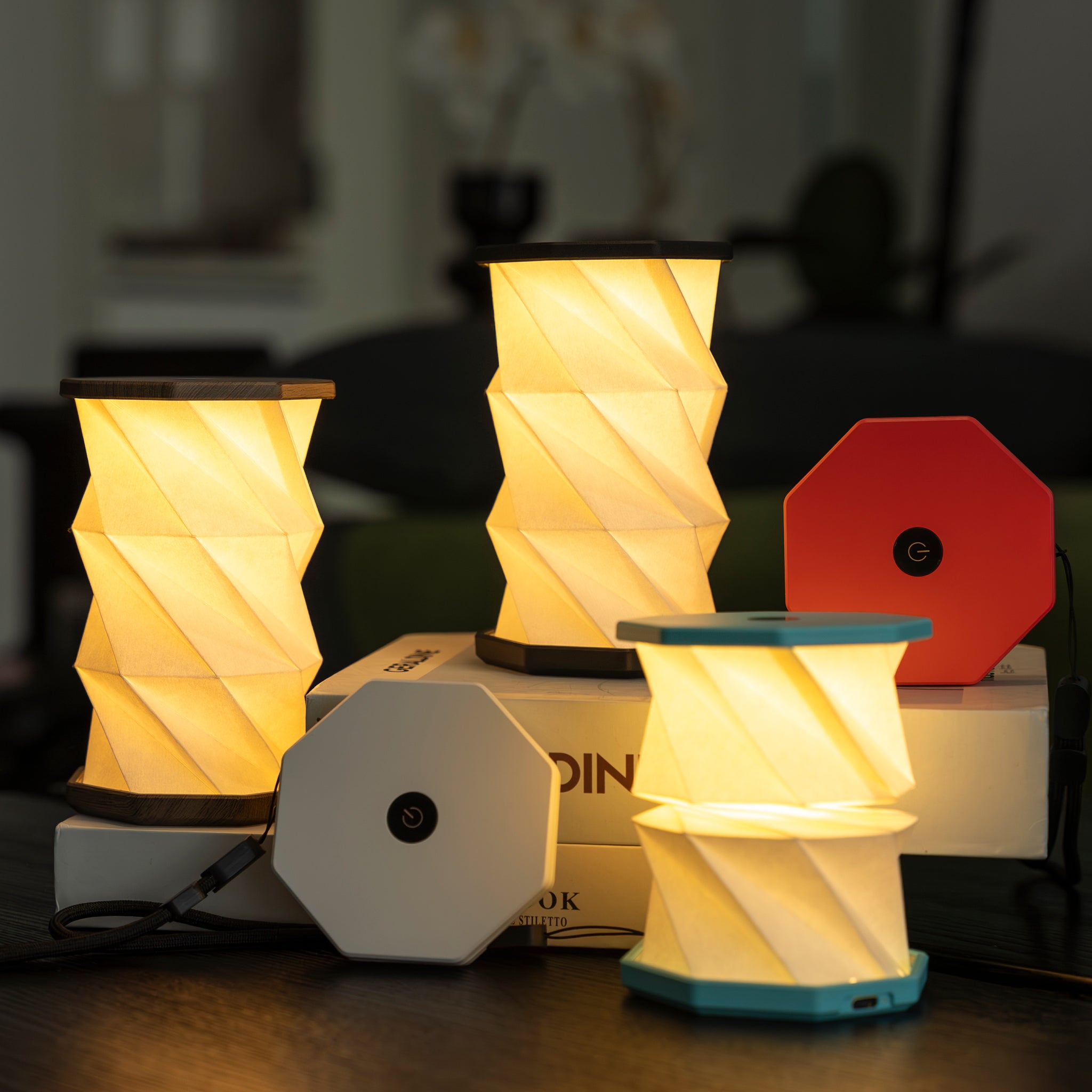 Compact, portable, and interactive, the Mini Hexagon Twist Light brings sculptural design and warm ambient light to any space. With a simple twist, it transforms from a modern accent into a versatile light source. Featuring a rechargeable USB-C battery (6-8 hours of use) and strong, durable paper. It's perfect for desks, bedside tables, and cozy corners.
