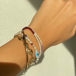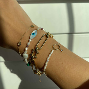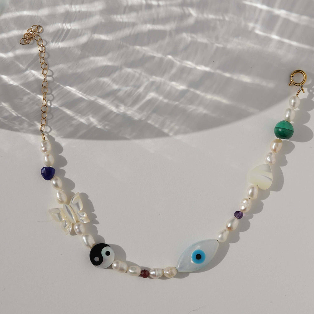 The Lexie Bracelet is a delicate, meaningful piece designed with a thoughtful mix of materials. It features a faceted Iolite rondelle for a touch of deep blue, a shimmering Mother of Pearl butterfly charm, and a round-cut Malachite gemstone with rich green tones. At the center is a hand-carved Mother of Pearl evil eye charm accented with turquoise and black spinel inlay. The bracelet is finished with 2.5mm to 3mm shell pearls that add a soft, luminous touch. Elegant on its own or perfect for layering, the Lexie Bracelet brings together beauty and symbolism in one refined design.