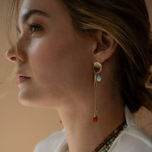 Crafted with vintage brass stampings found in one of Hailey's warehouse treasure hunts, these Talcott Earrings have been expertly polished and adorned with lively gemstones. The combination of turquoise and brass creates a chic and bohemian look.