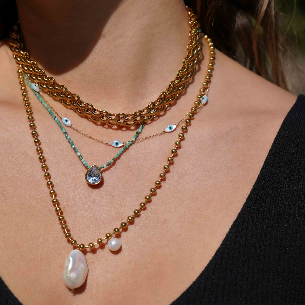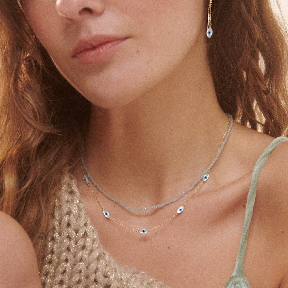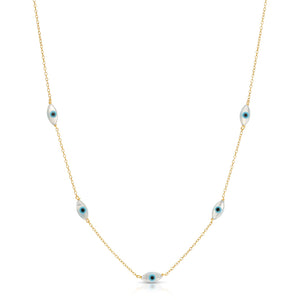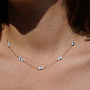 Add a wink of whimsy and a dash of protection with the Mini Evil Eye Necklace, a delicate, adjustable chain dotted with tiny hand‑carved Mother of Pearl evil eye charms inlaid with turquoise and black spinel, plated in waterproof, tarnish‑free 14K gold PVD stainless steel for style that shines with good‑vibe intent.